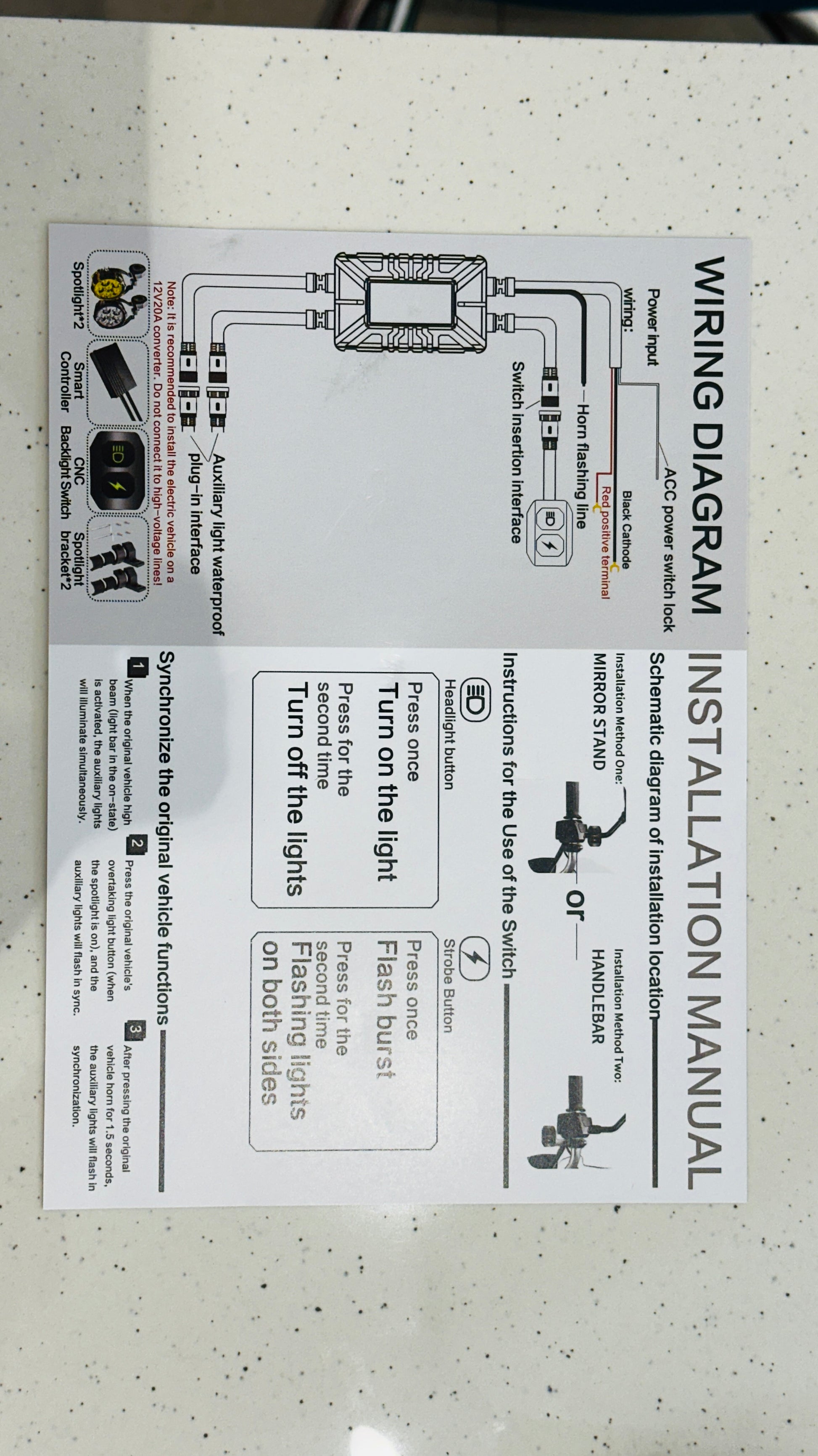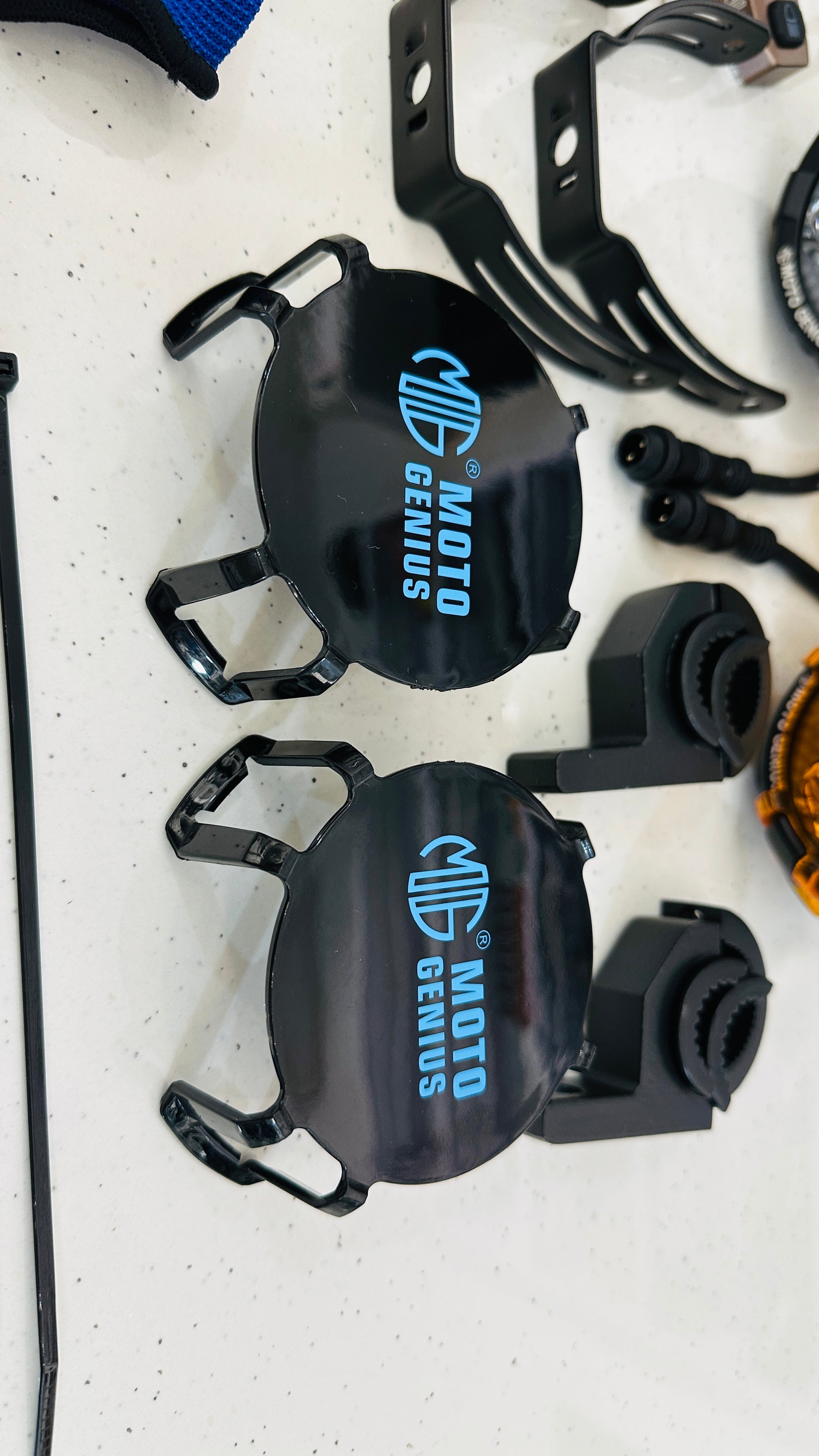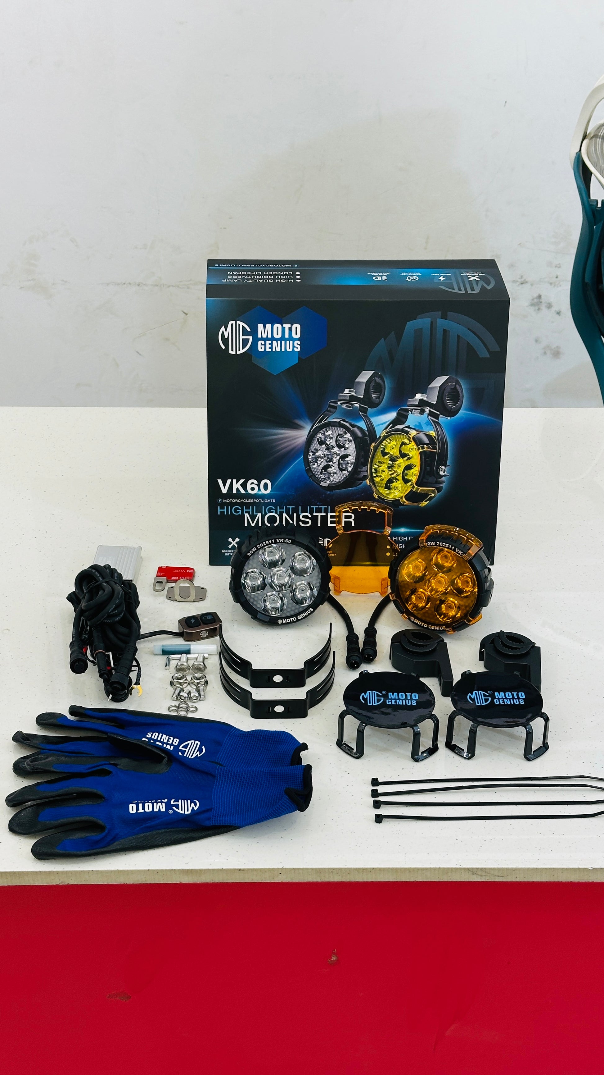 Moto Genius 90W Fog Light Kit – High-Power LED with Wiring Harness, Clamps, Zip Ties, Gloves & Layout Diagram