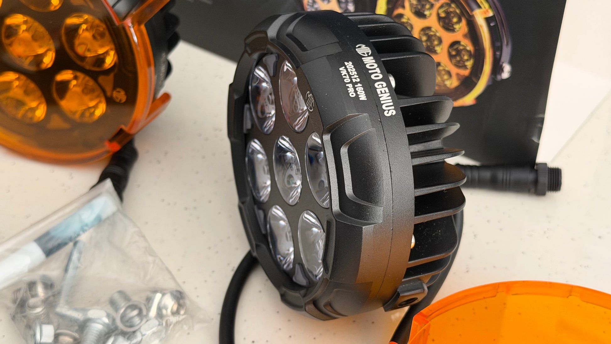 Moto Genius VK 70 Pro Fog Lights – 90W LED with DRL, Wiring Harness, Mounts & Yellow Solid Covers | Ultra Bright Touring Lights